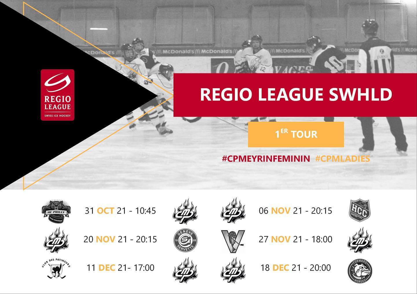 Le calendrier du championnat SWHLD est désormais connu. Le CP Meyrin entrera en lice le 31 octobre à 10h45 contre HC Prilly Black Panthers Féminin à la Vaudoise Aréna à Lausanne. Notre équipe accueillera son premier match de championnat contre HC La Chaux-de-Fonds Féminin le 6 novembre à 20h15 à la patinoire des Vergers. On espère vous retrouver nombreux dans les gradins.