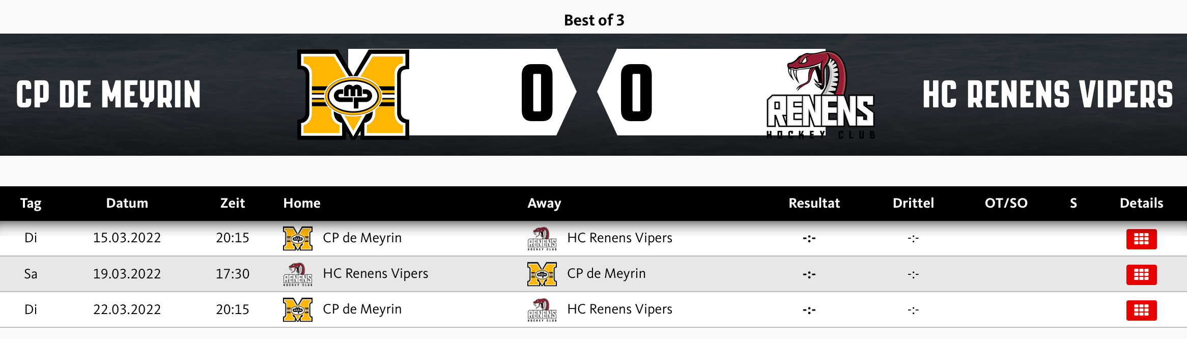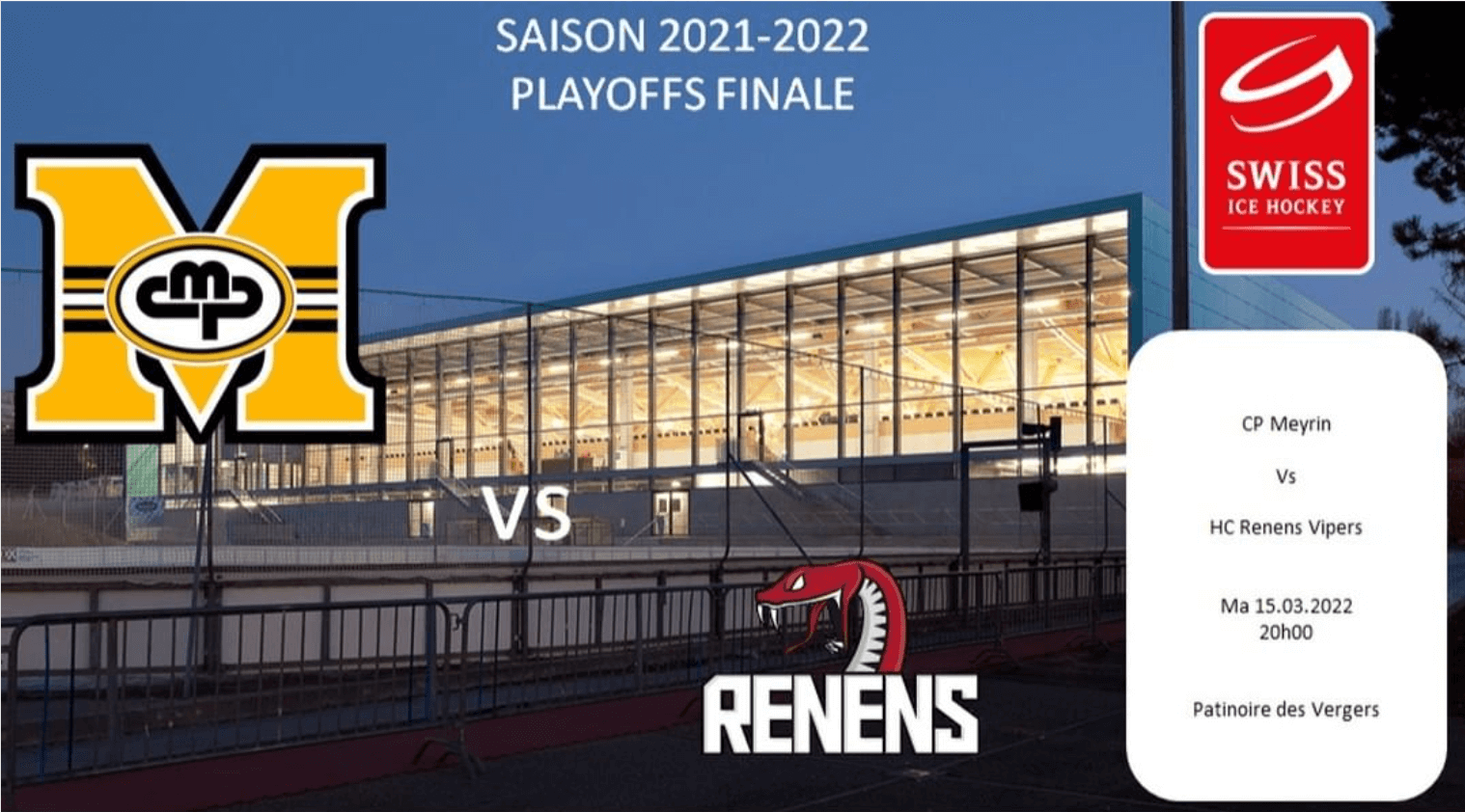 Le CP Meyrin affronte le HC Renens Vipers en finale du groupe 3 de la 3ème ligue dans une série au meilleur des 3 matchs.