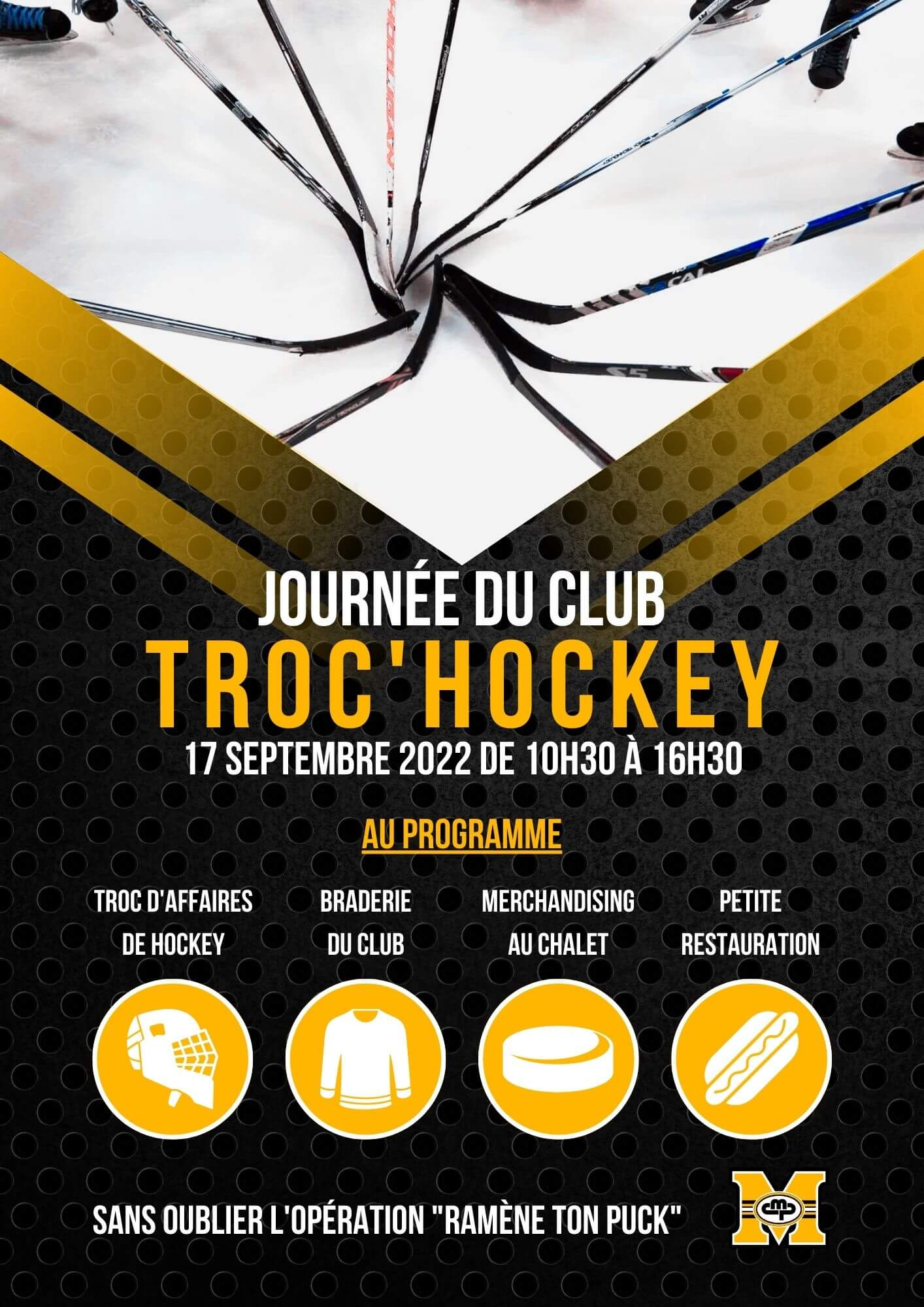 - Opération Ramène ton puck : Vous avez des pucks qui trainent à la maison ? Que vous auriez peut-être ramassés à la patinoire des Vergers ? C’est l’occasion de les ramener et remplir les bidons de votre club.