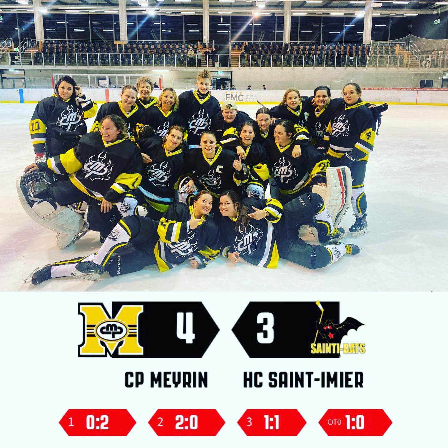 Un match épic: dominées dans le jeu, menées par 2 buts, elles recollent au score grâce Oriane Rickenbacher puis prennent l’avantage 3 à 2 grâce à Lou Simonett. Les gardiennes du CPM, Marie Wernsdorfer puis Véronique Galvan multiplient les parades décisives jusqu’à l’égalisation de Saint-Imier à 16 secondes de la fin. Place aux tirs aux buts qui mettent en exergue une autre héroïne, Ludivine Mani-Geschworner qui nettoie la même lucarne coup sur coup. Champagne !