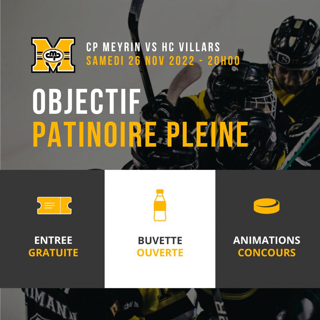 Ce samedi 26 novembre 2022, le CP Meyrin – 1ère équipe affrontera l’équipe du HC Villars à 20h00 à la patinoire des Vergers pour un match au sommet.
